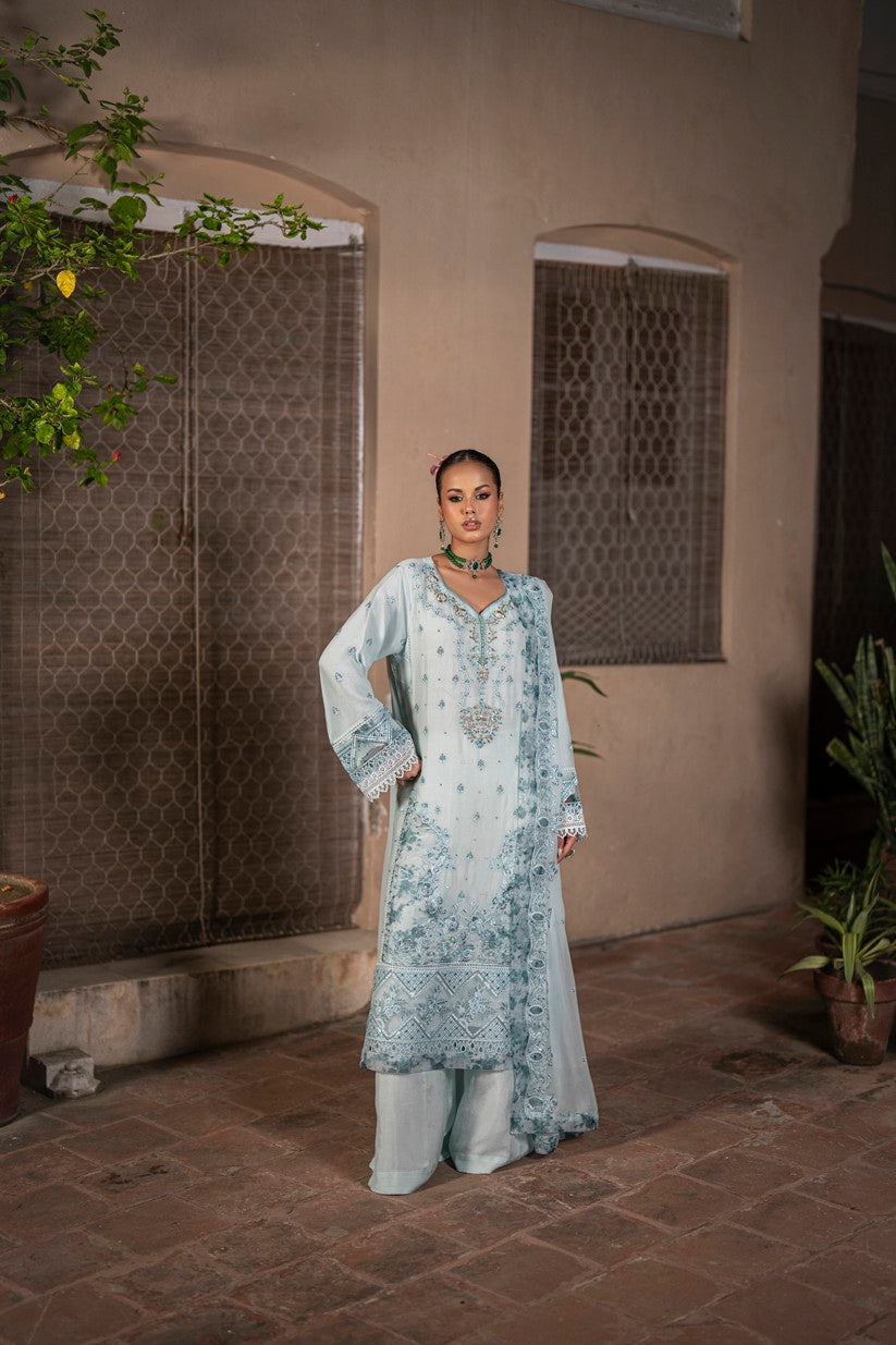 Dupatta: The chiffon dupatta is adorned with graceful embroidery and cutwork, complemented by a striking printed organza border on all four sides – adding depth, elegance and movement to the ensemble.